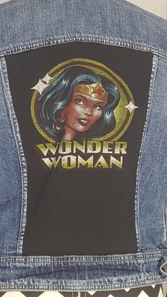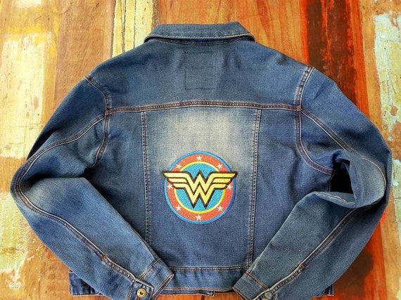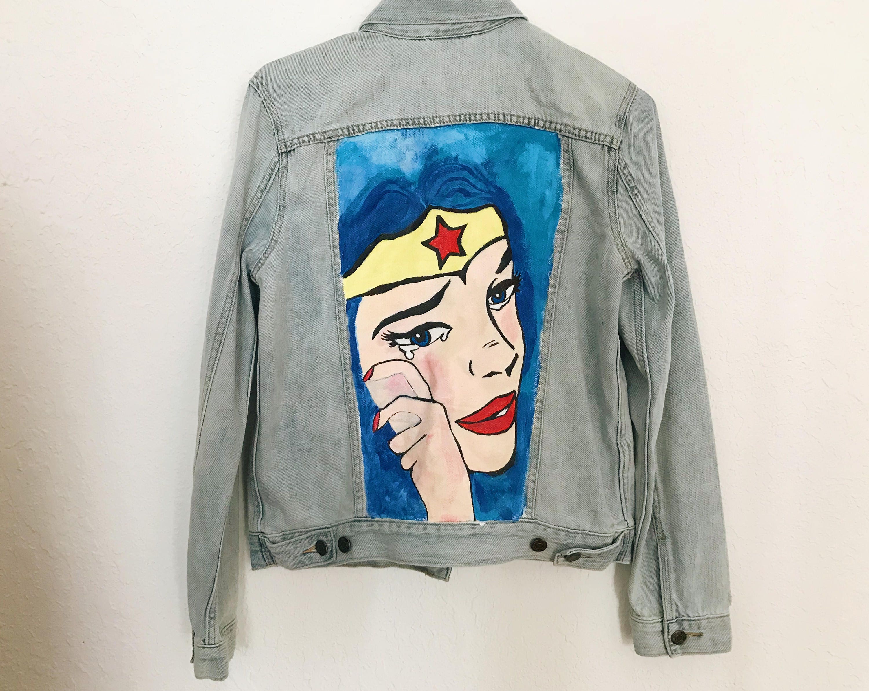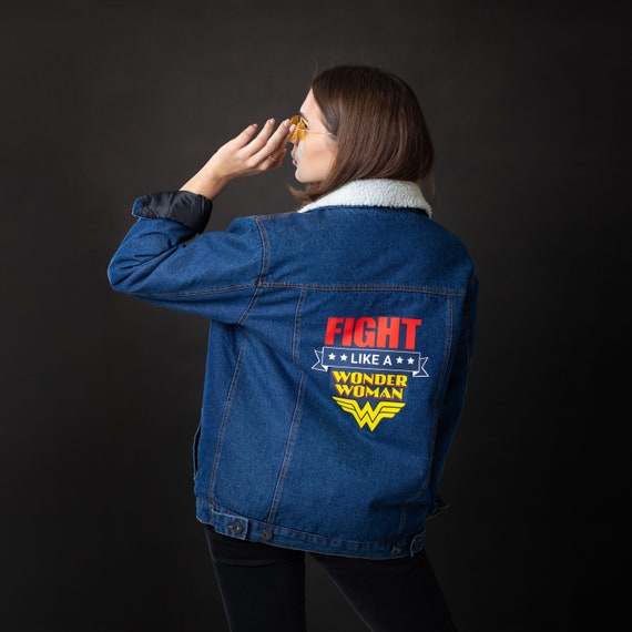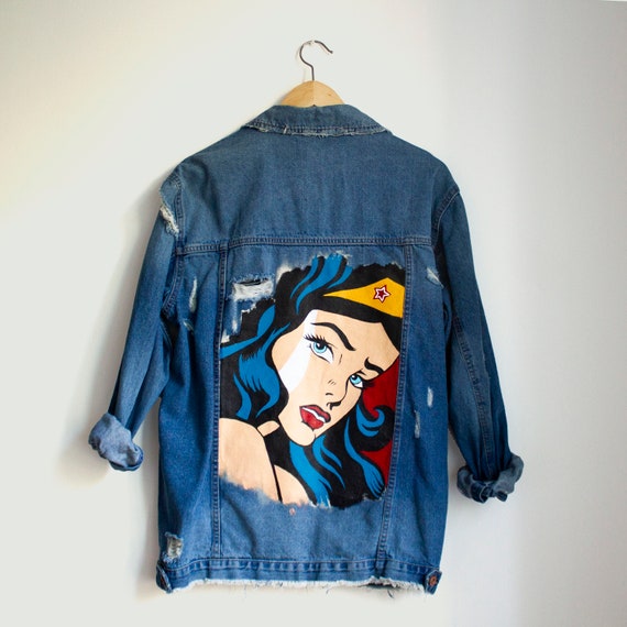 Hand Painted Blue Jeans Jacket Unique Pattern Pattern Wonder Woman Size 42 Hand Painted By K4u Creations Customizacao De Roupas Roupas Jaqueta